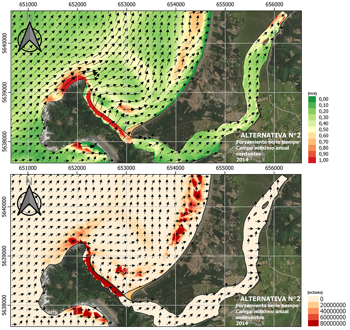 Estudio integral del funcionamiento hidrodinámico del Río Queule, desembocadura y sectores litorales. Se ensayaron tres alternativas de proyecto de mejoramiento de la operatividad de navegación. Se modeló numéricamente el oleaje, hidrodinámica, transporte de sedimentos y la calidad de agua